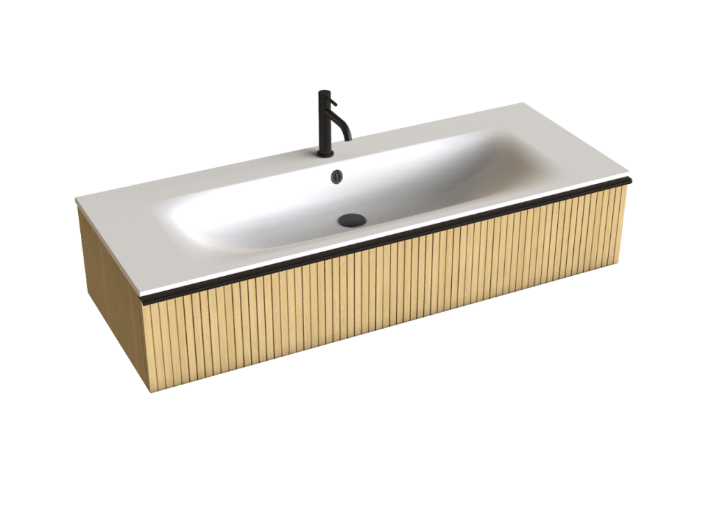 La façade ondulée de la console Illusion apporte une personnalité originale et raffinée à votre décor de bain.