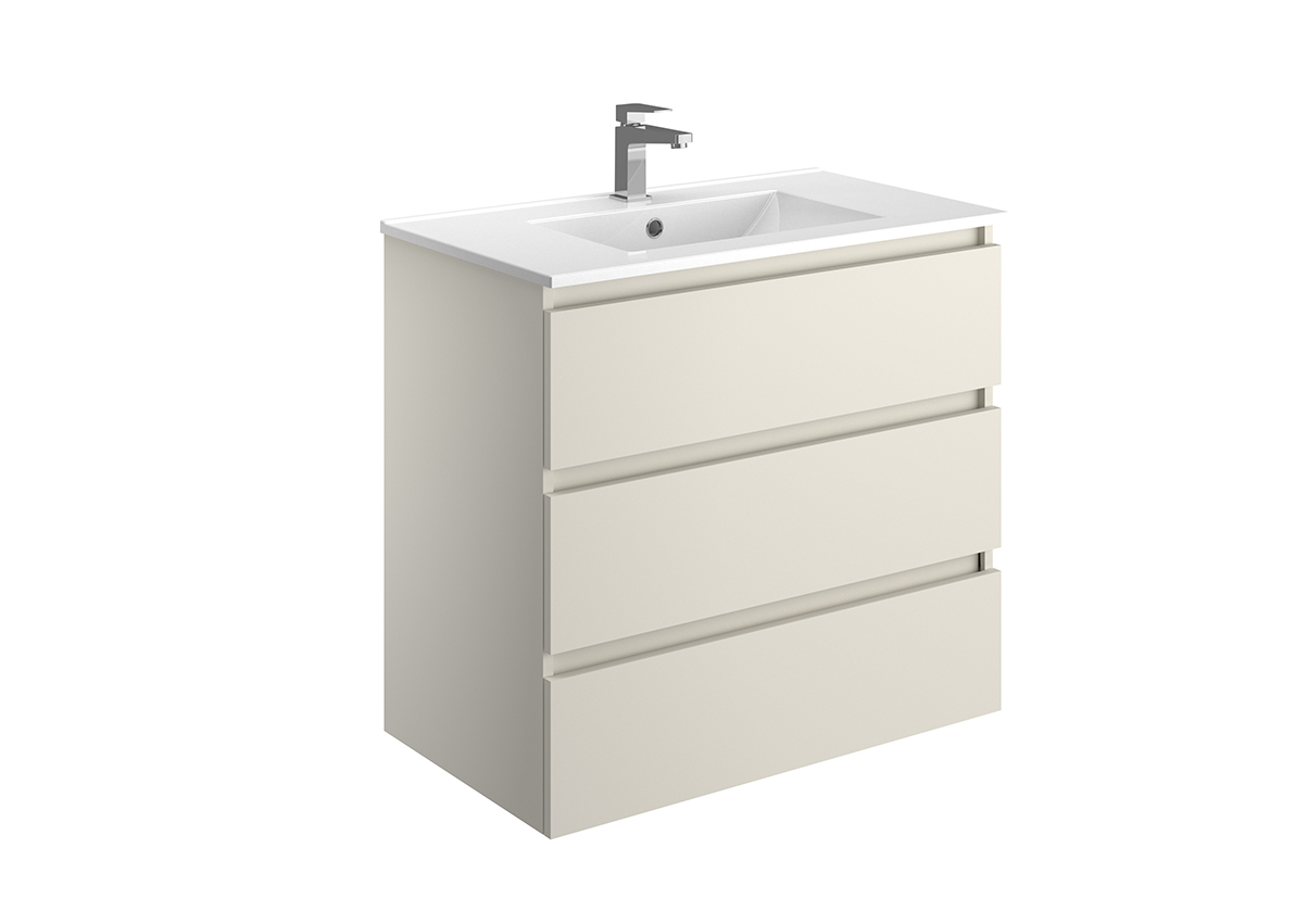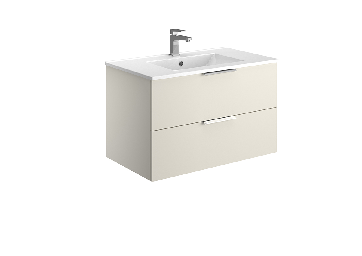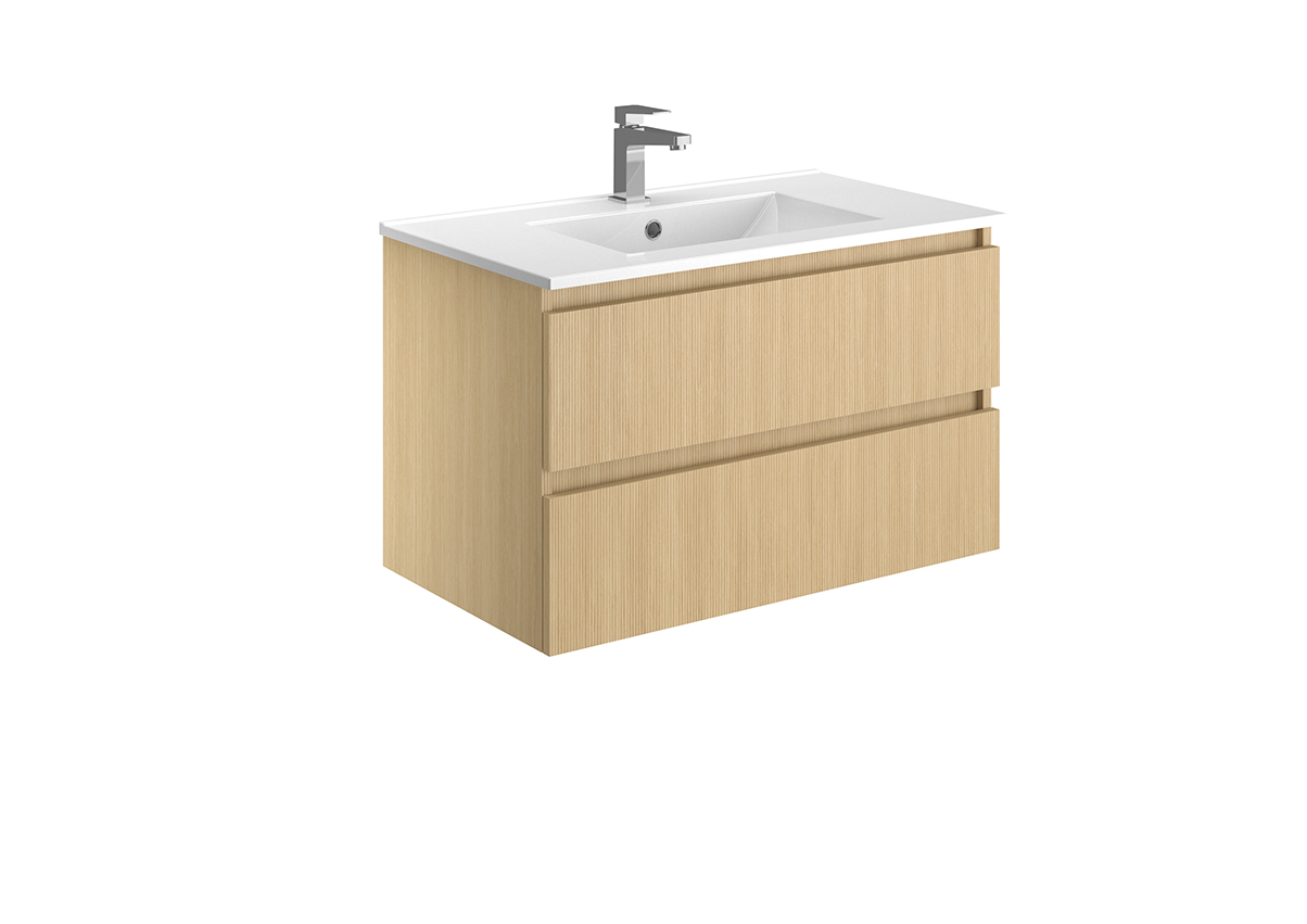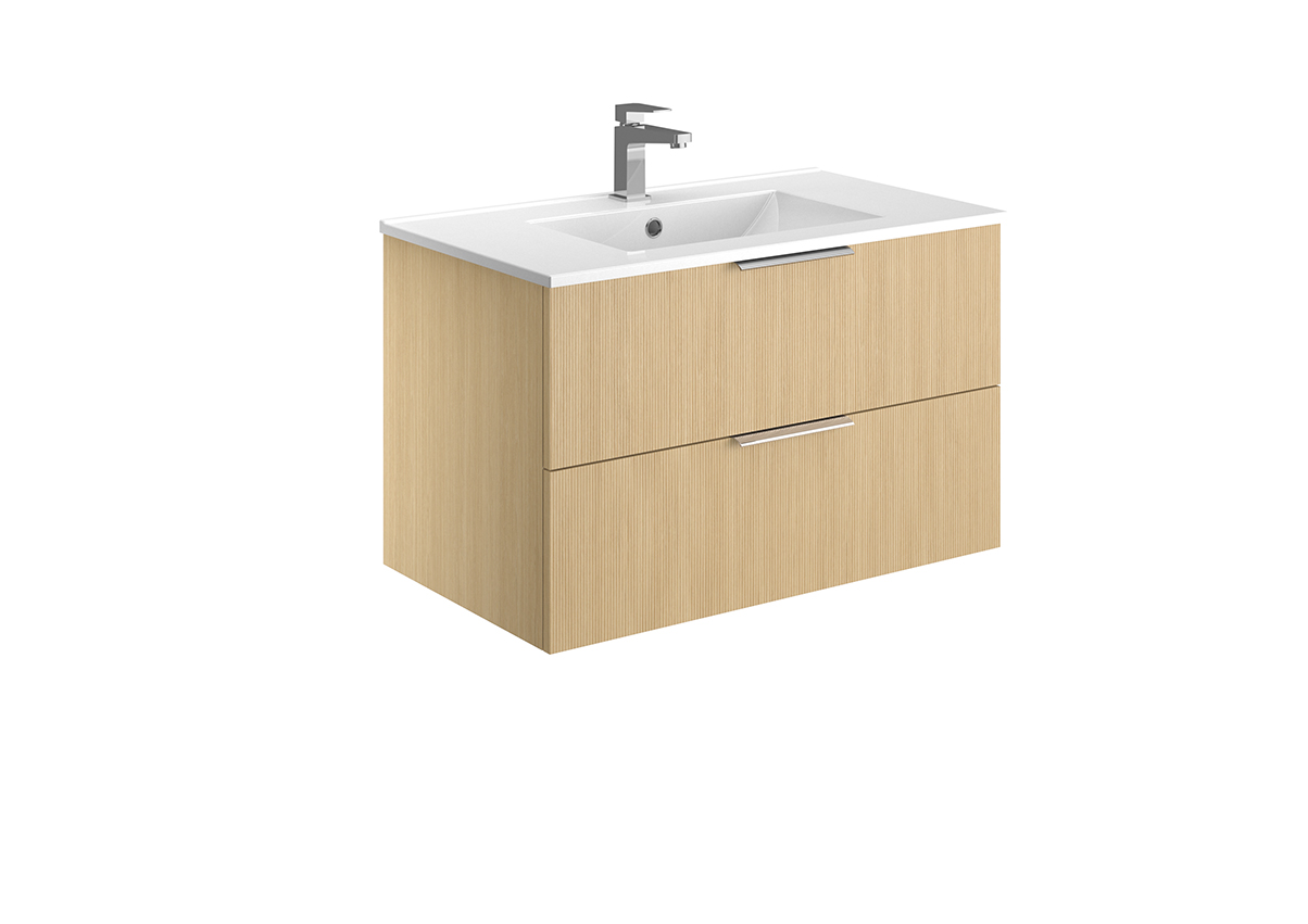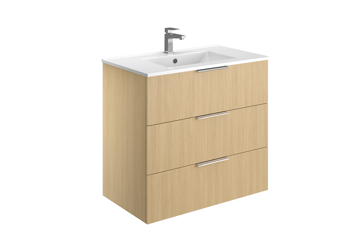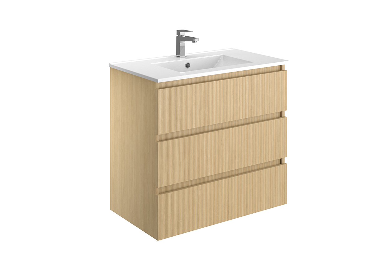 Meuble vasque – 2 ou 3 tiroirs ou portes – Plan vasque céramique blanc brillant – Prise de main ou poignée – Option pieds – Colonne assortie