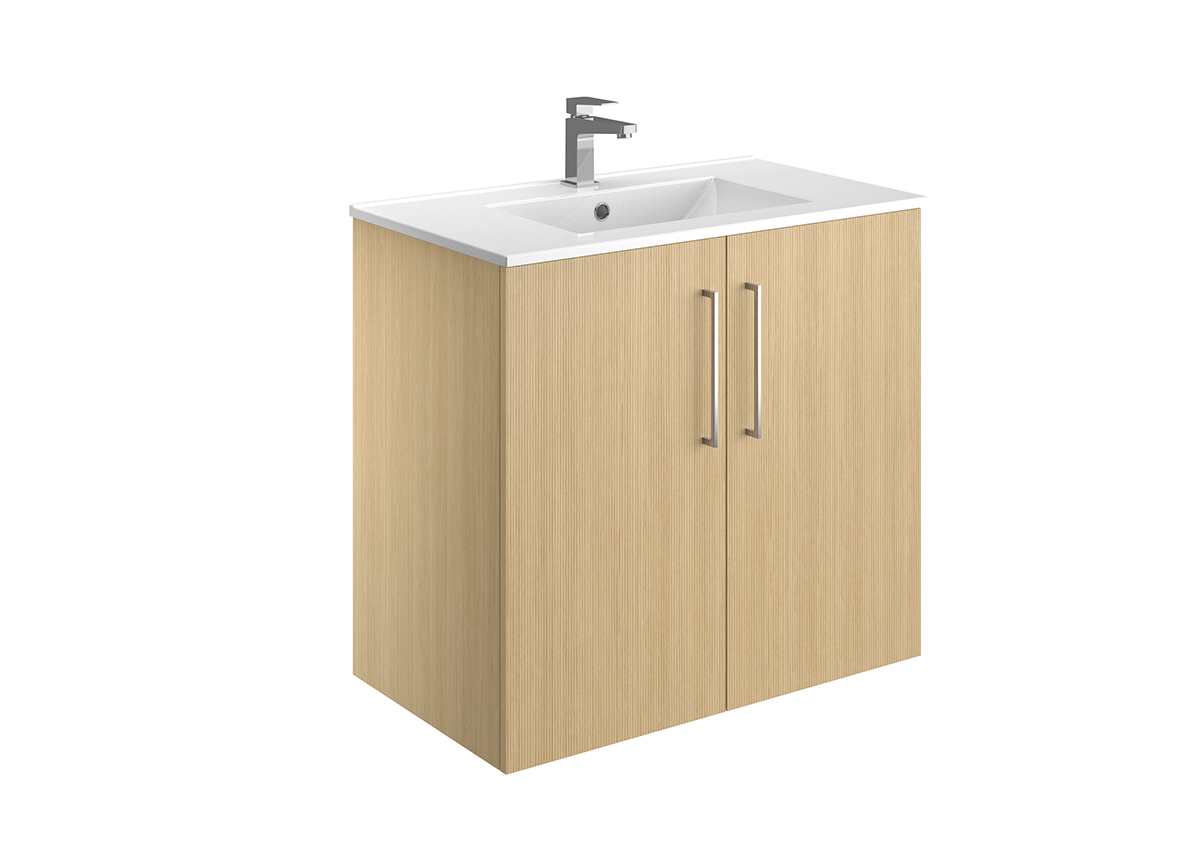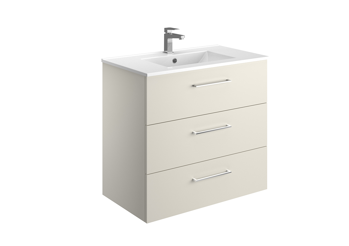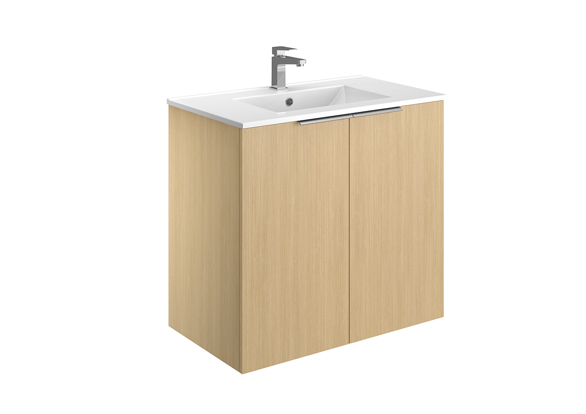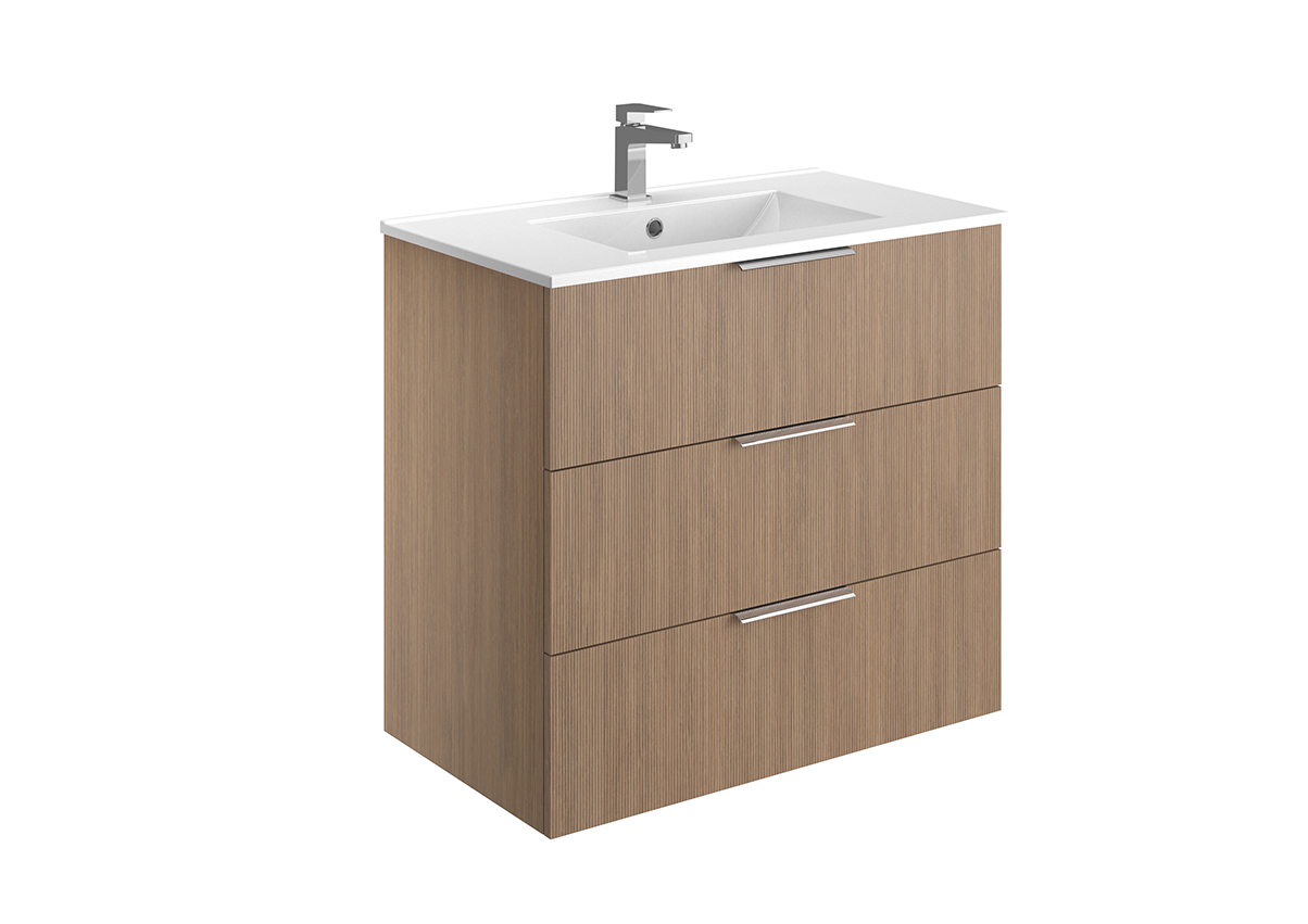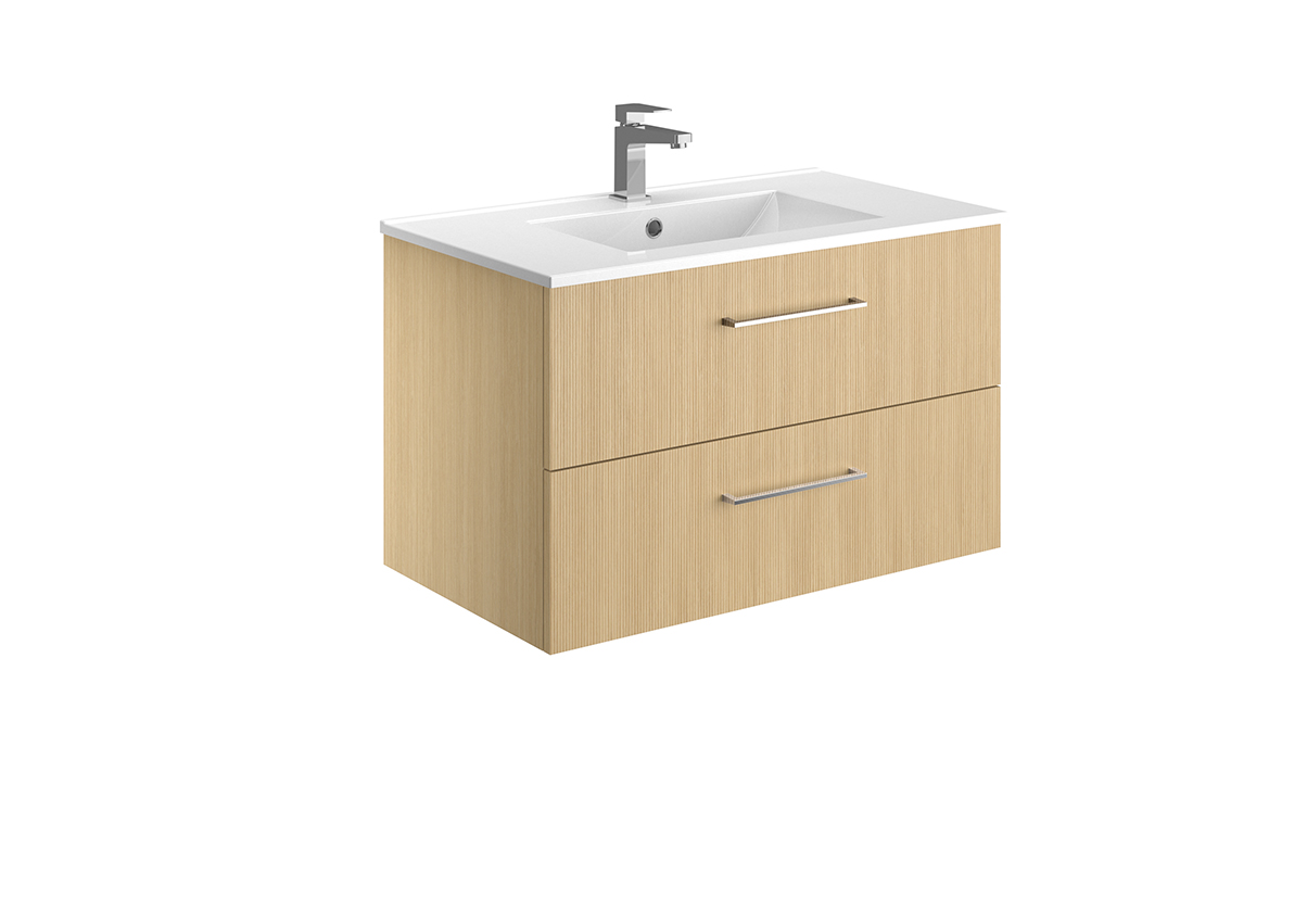 Meuble vasque – 2 ou 3 tiroirs ou portes – Plan vasque céramique blanc brillant – Prise de main ou poignée – Option pieds – Colonne assortie